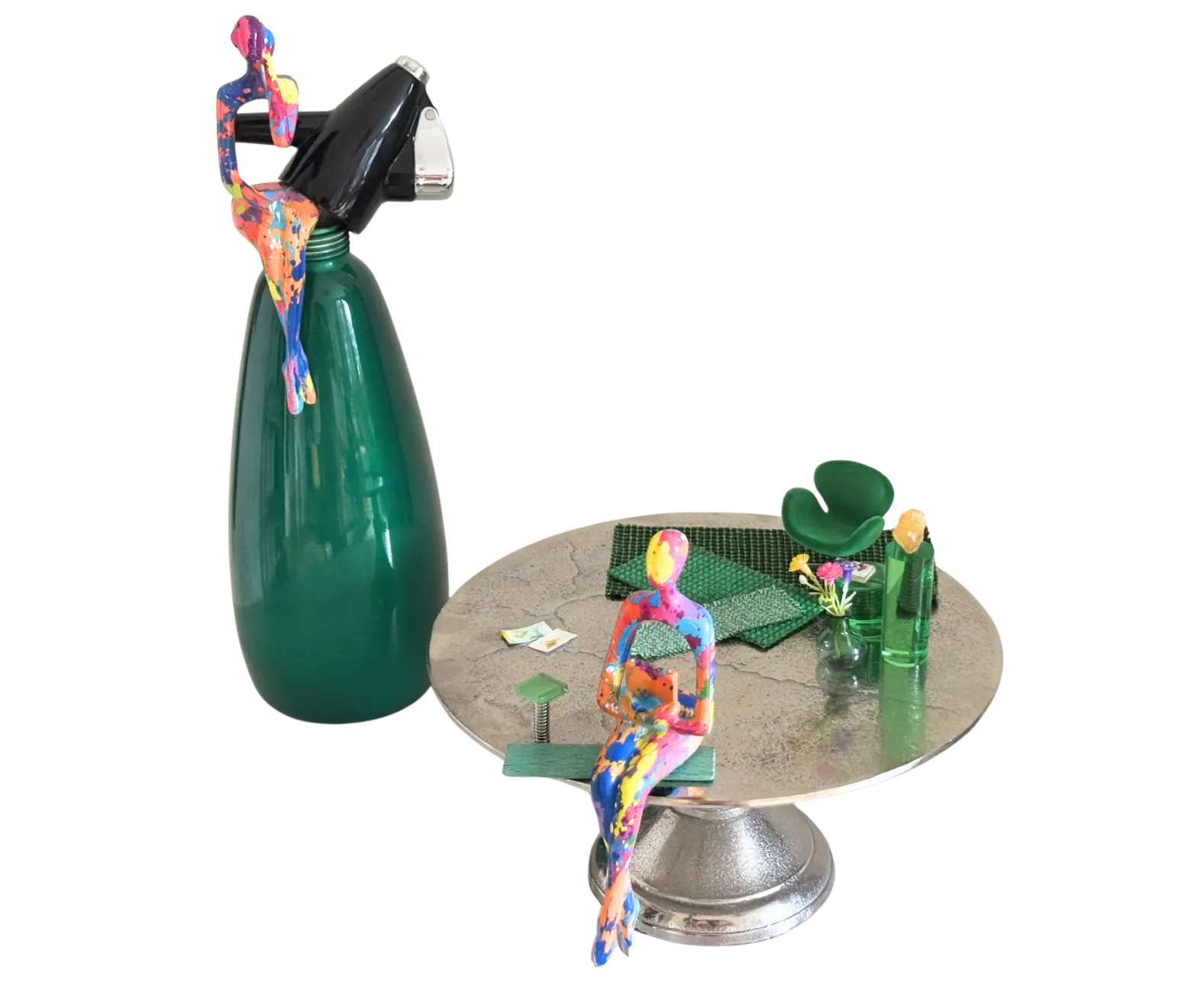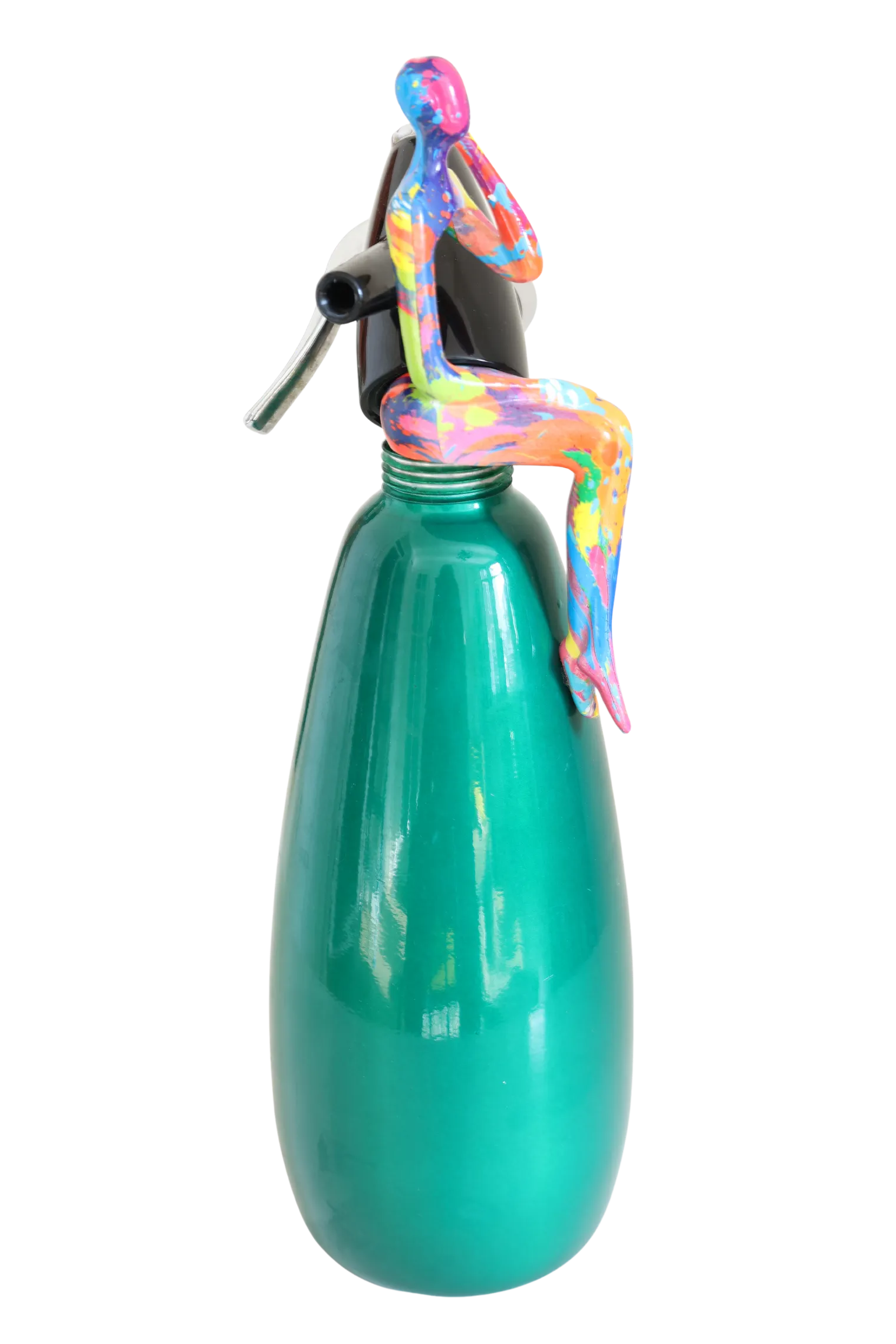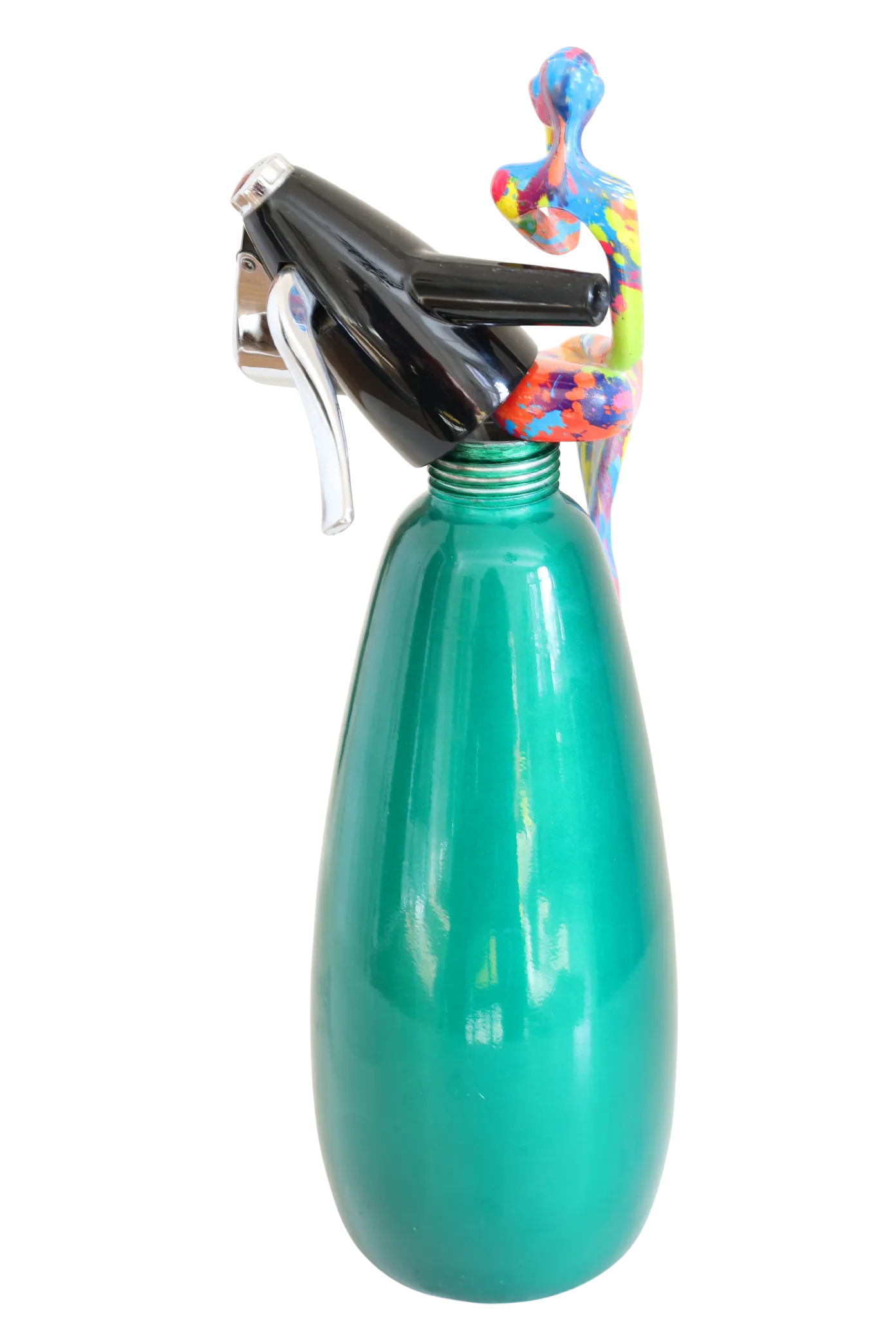 Materiaal: Vintage metalen spuitfles met hars vrouwfiguur