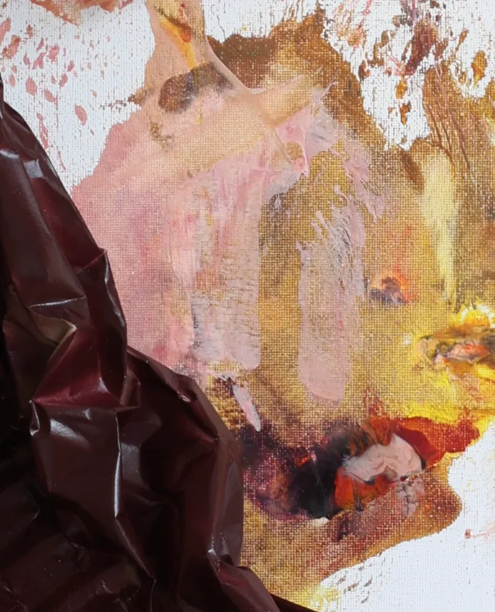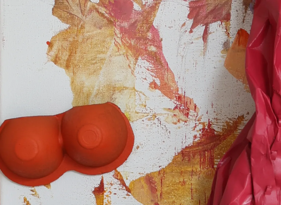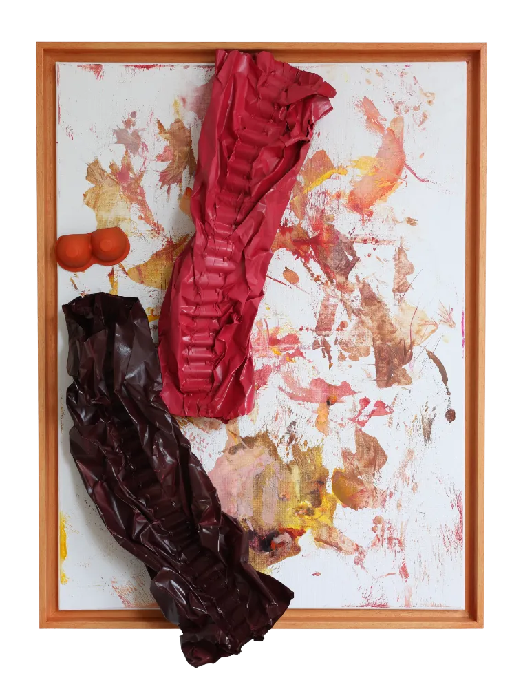Materiaal: Bijenwas met papier op schilderdoek in oranje gebeitste beukenhouten baklijst