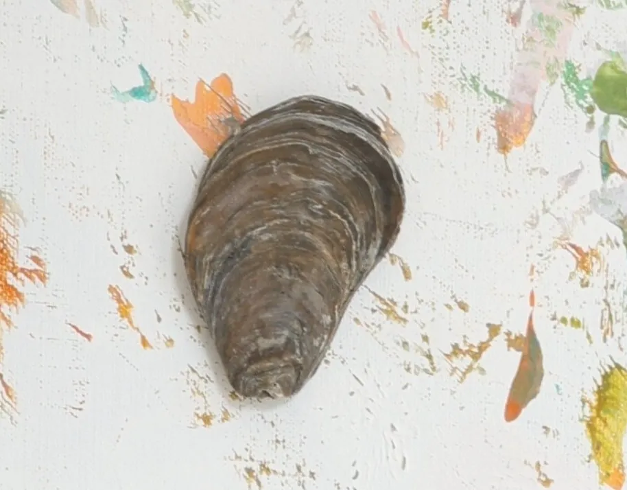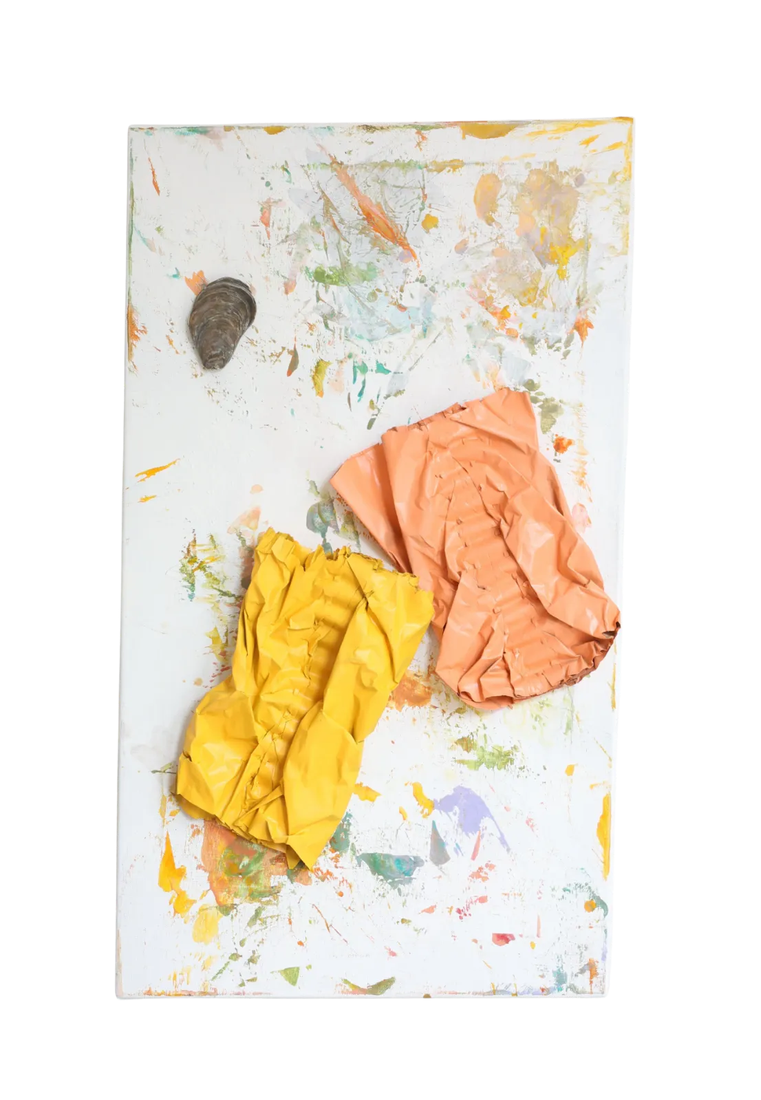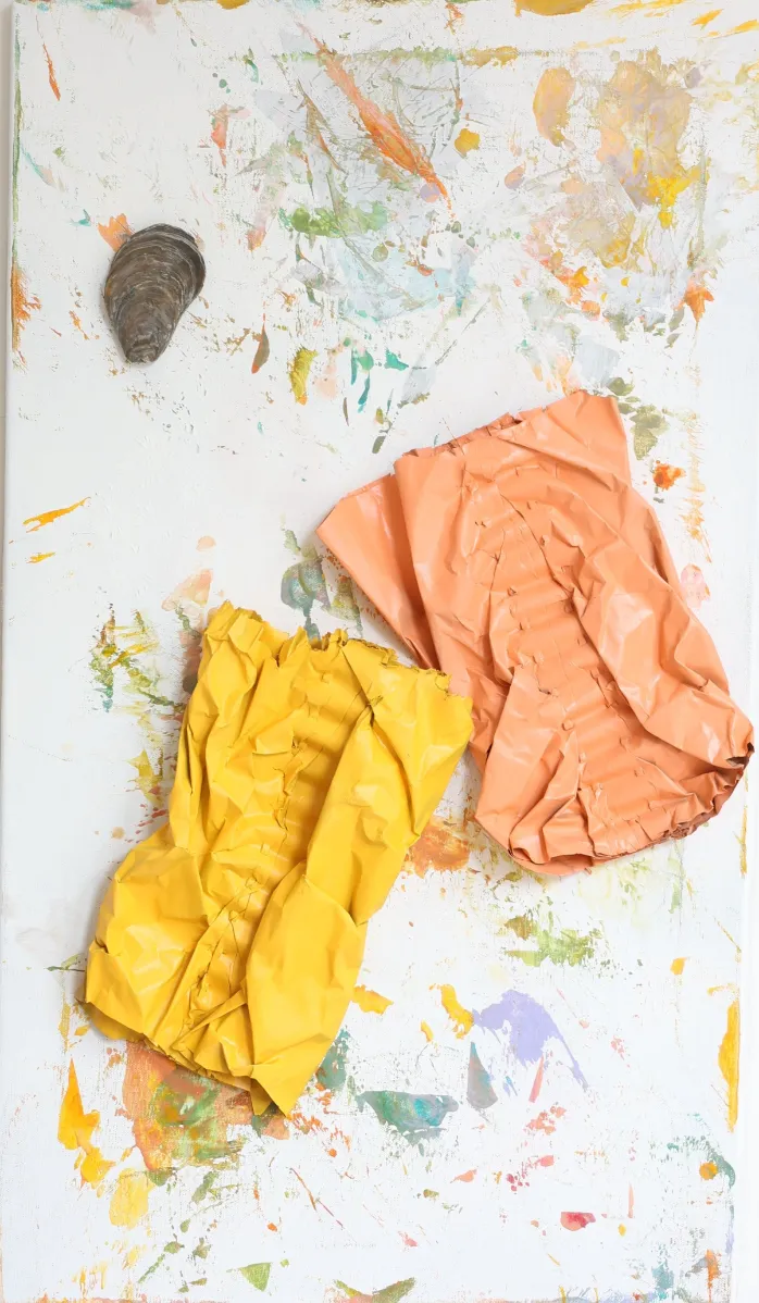 Materiaal: Bijenwas met papier op vintage schilderdoek met element uit de onderwaterwereld