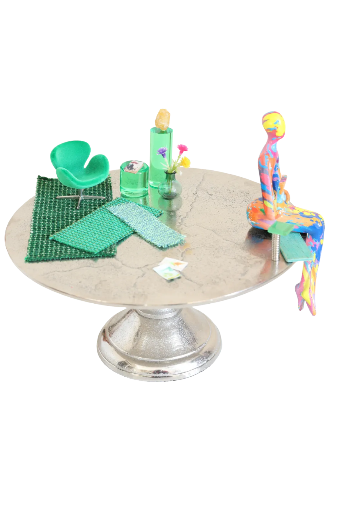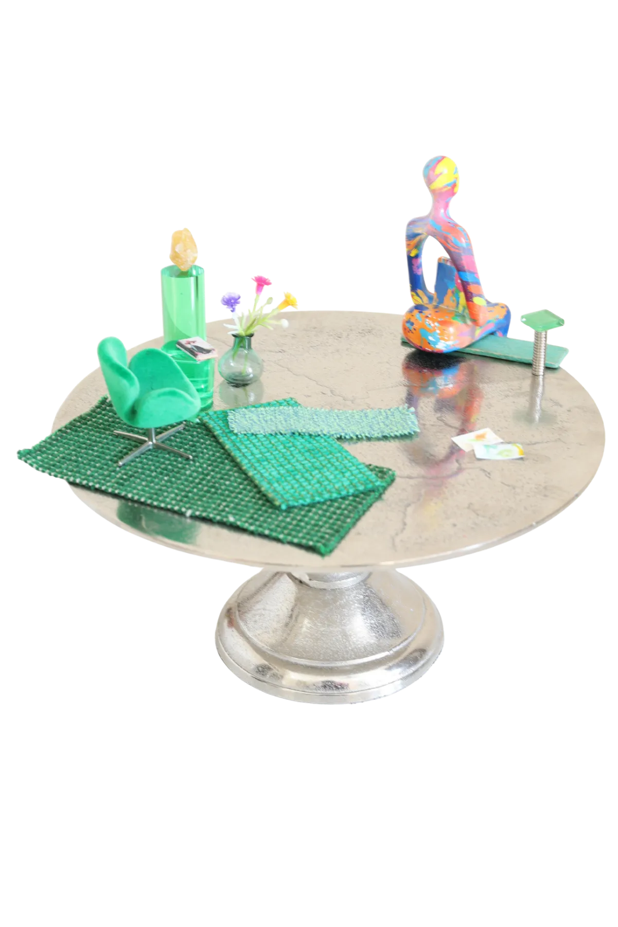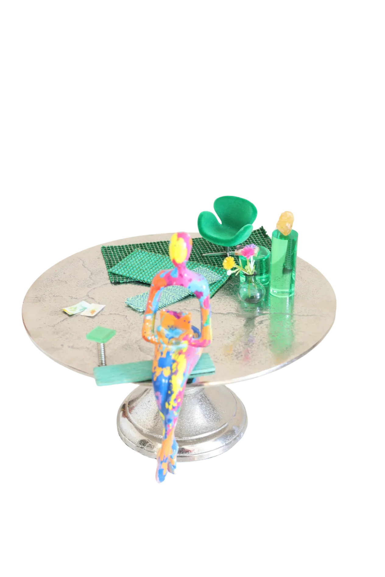 Materiaal: Zilverkleurige etagère met diverse materialen en hars vrouwfiguur