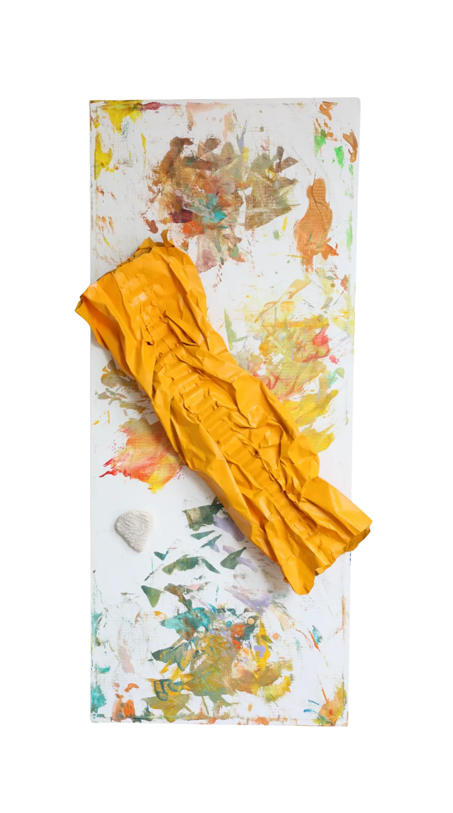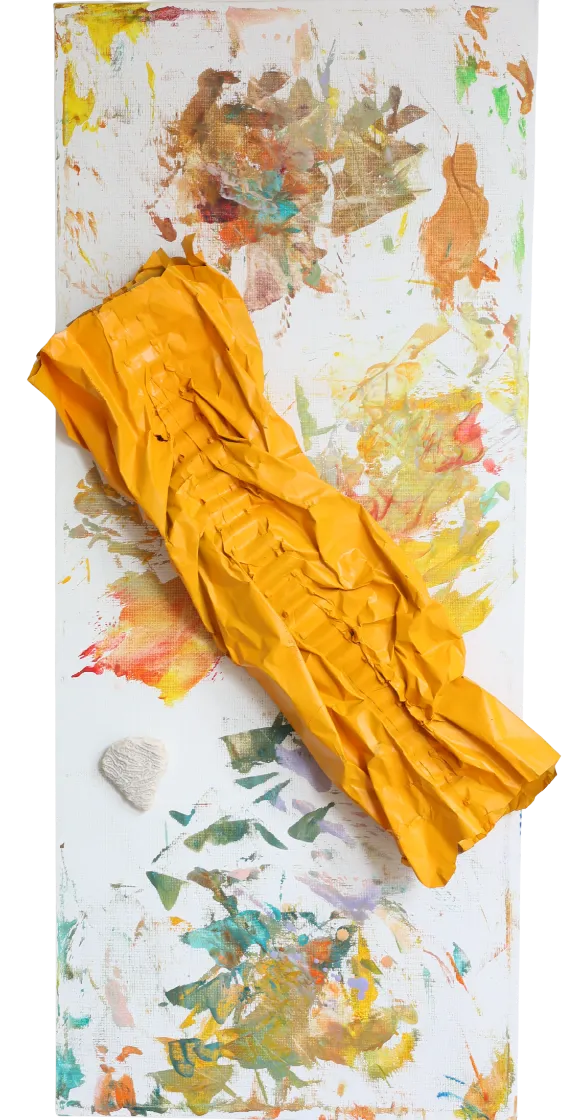 Materiaal: Bijenwas met papier op 3D herbruikt schilderdoek met element uit onderwaterwereld
