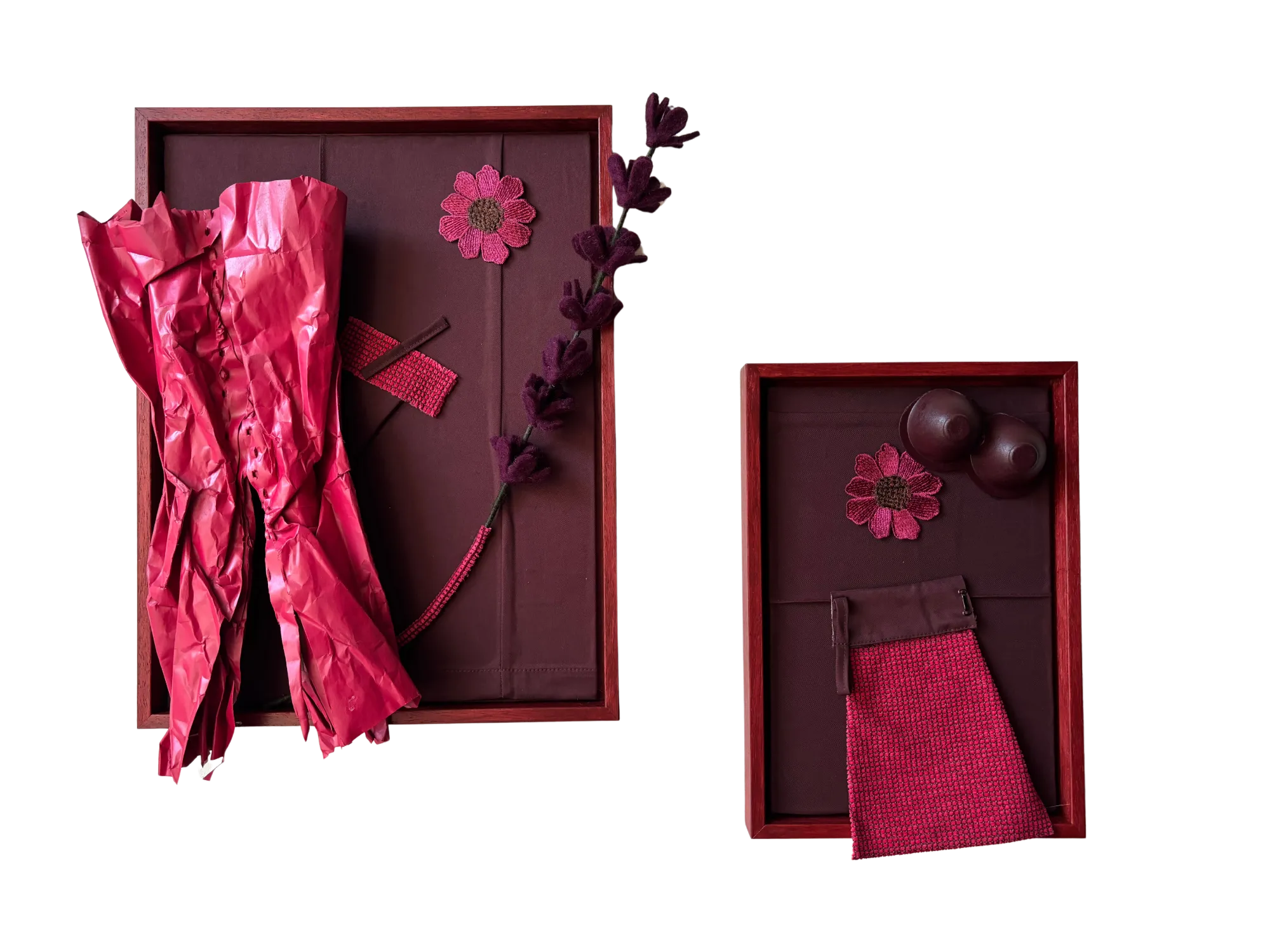 Materiaal: Textiel met karton in een roze / rode houten baklijst