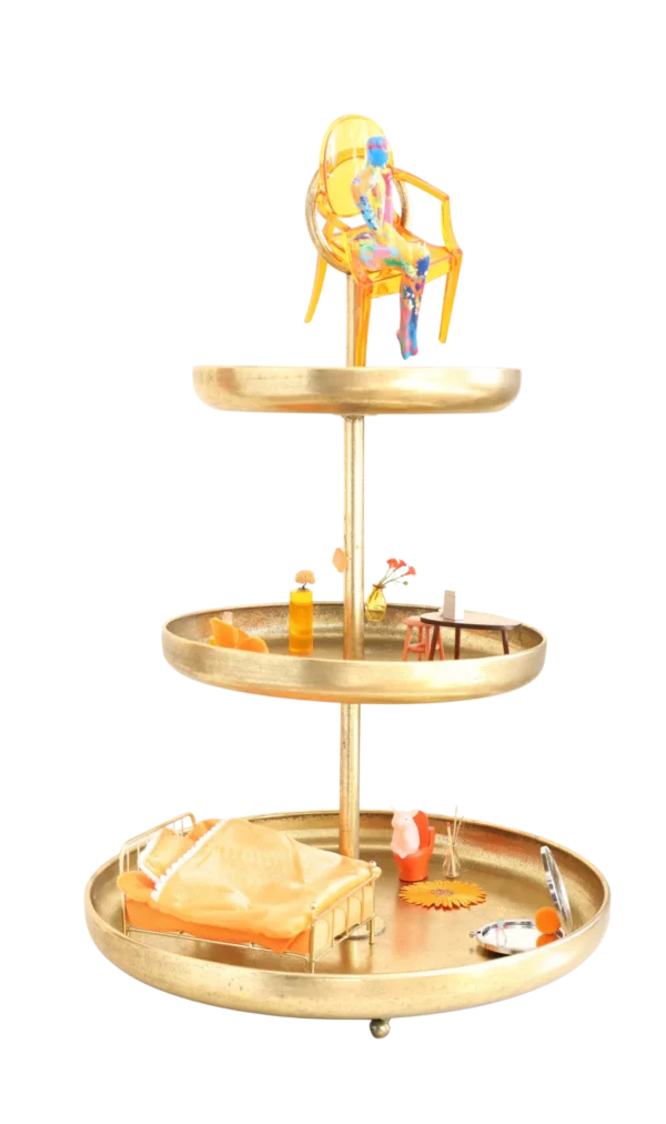 Genieten is een hars vrouwfiguur met verschillende taferelen zittend op een gouden etagère