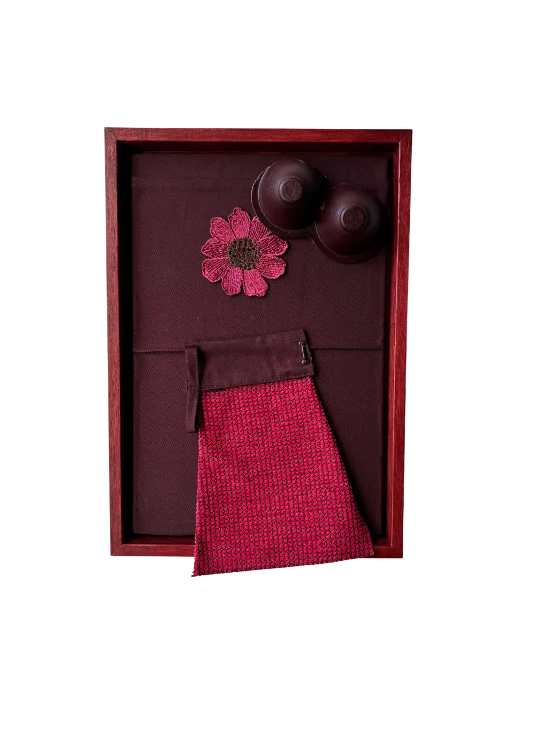 Vrouwelijkheid 1 is een combinatie van textiel en karton in een roze / rode houten baklijst