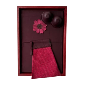 Vrouwelijkheid 2 is een combinatie van textiel en papier in een roze / rode houten baklijst